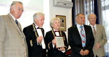 De la stânga la dreapta: Acad. Cristian Hera, Prof. Dr. Vasile Cândea (Preşedintele AOŞR), Prof. dr. Gallia Butnaru, Prof. Dr. Petru Andea (Decan UP Timişoara), Gh. Sim (Preşedintele ASAS)